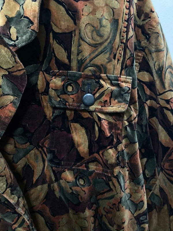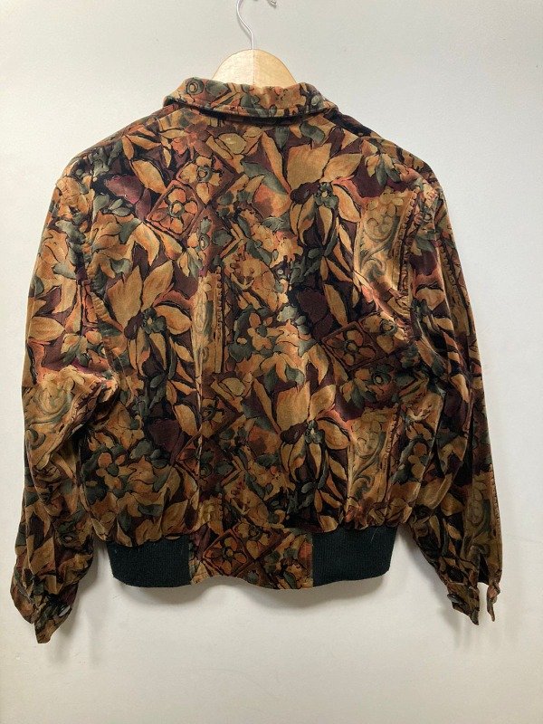Saco de tela aterciopelada, estampada con plantitas, flores y arabescos vintage. Solapa tipo blazer pero corte de campera Bomber. Cintura con elástico. Bolsillo superior.