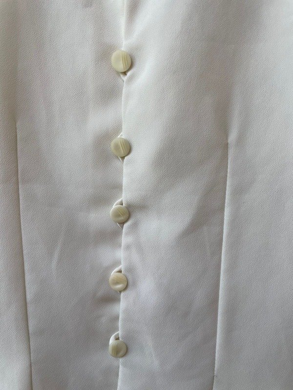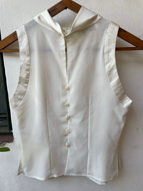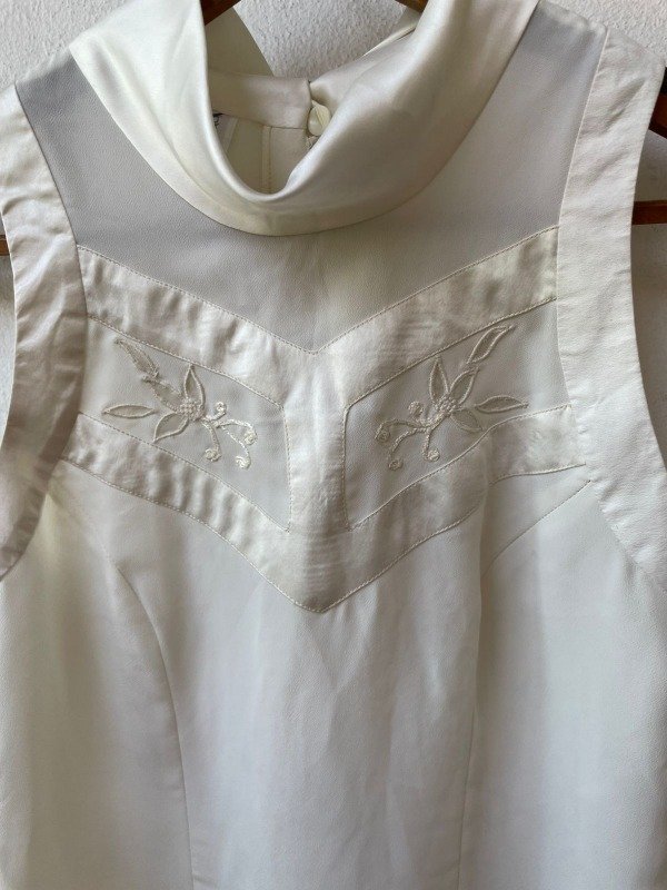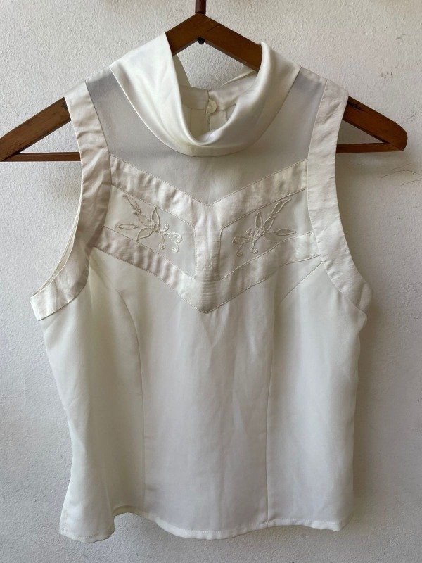 Blusa de fiesta en crepe con detalles en satén y bordados. Cuello caído y botones traseros.