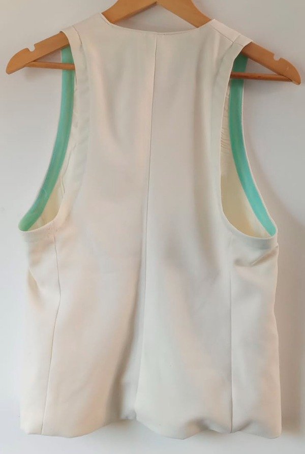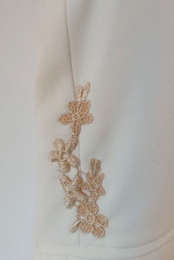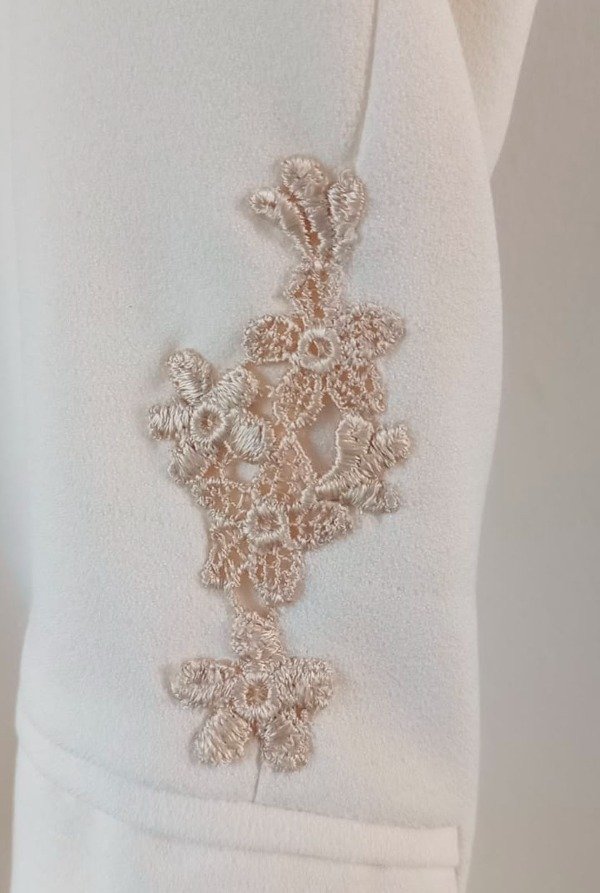 Textil tipo Crepe. Botones carey nuevos. Encaje aplicado en frente.