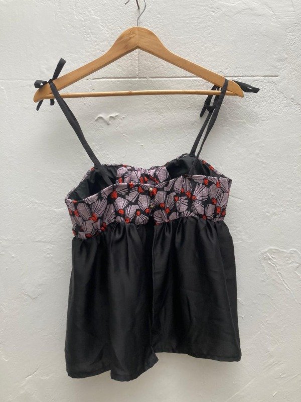 Top en gasa y creppe, con espalda abierta y breteles ajustables,