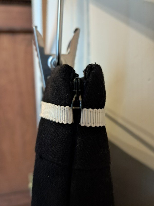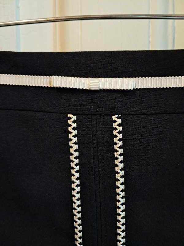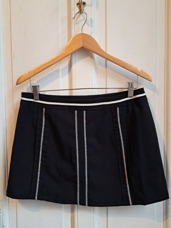 Falda corta cin tajito en delantero. Detalles de cintas y cierre invisible en el costado.