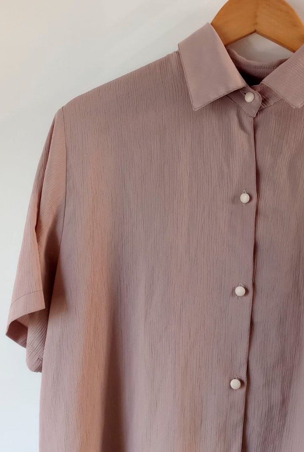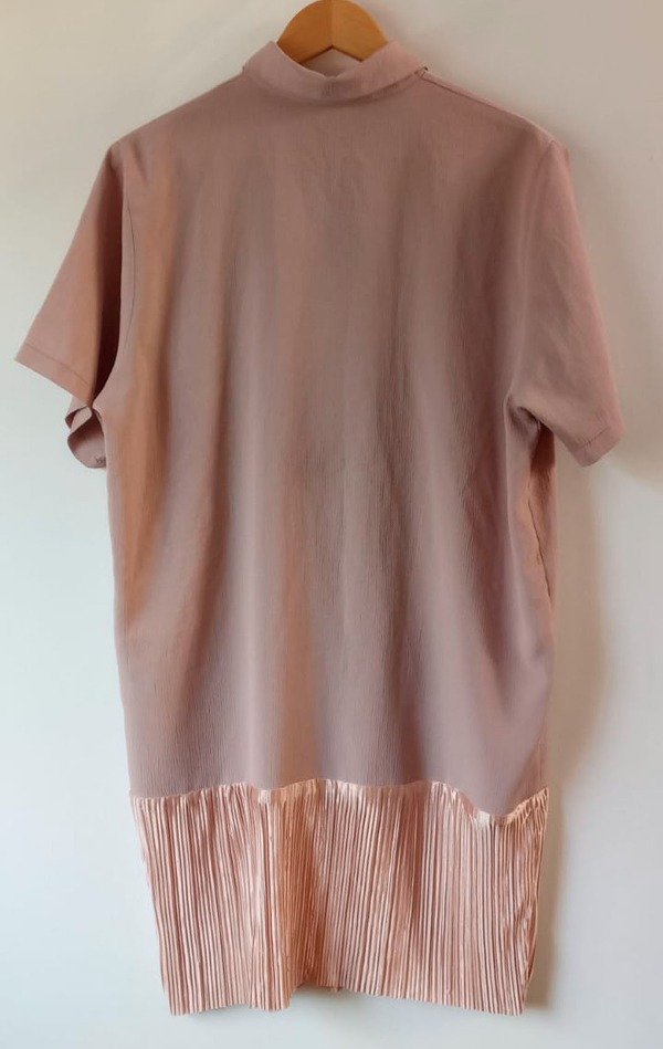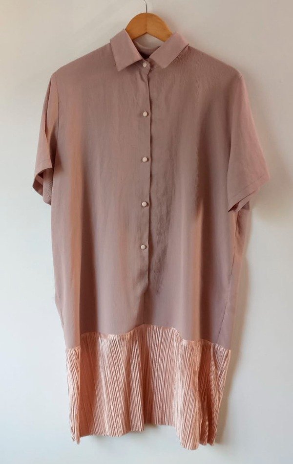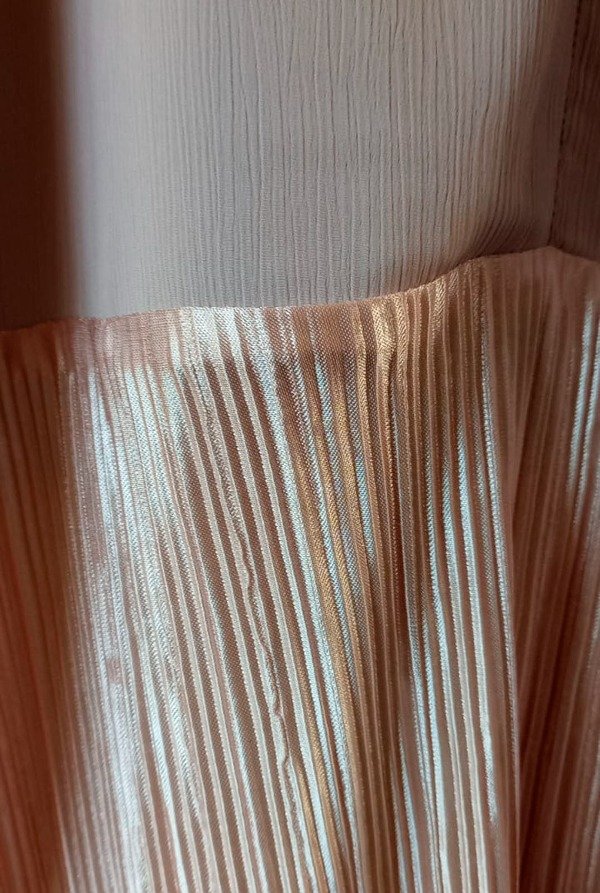 Tela liviana tipo sedita, con textura, color visón. Aplique textil plisado y metalizado en ruedo.